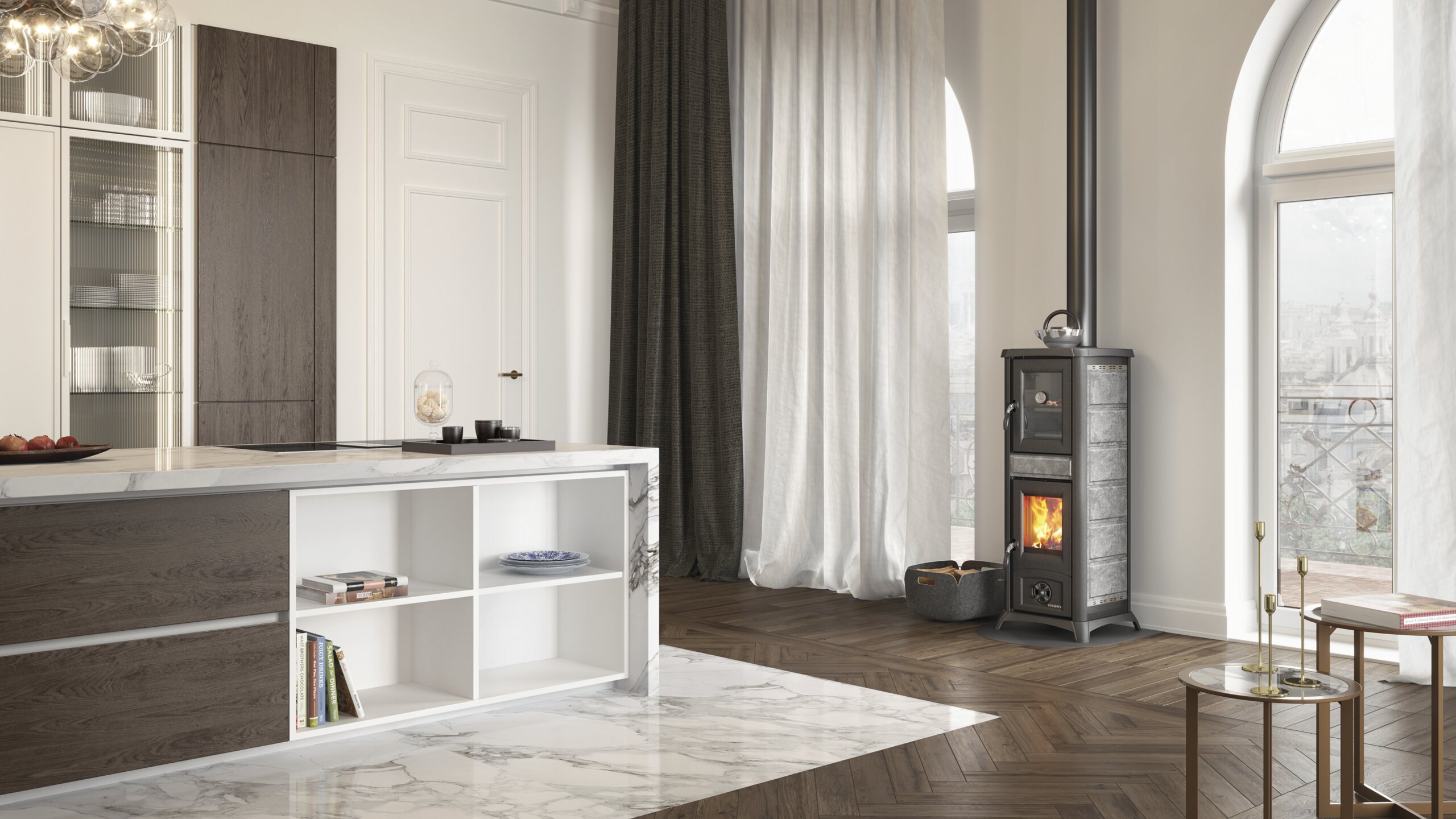 Calentar y cocinar en uno. Elegante revestimiento de piedra natural y práctico horno esmaltado de 19 litros para un calor acogedor y sabores auténticos, garantizando bajas emisiones y máxima eficiencia.