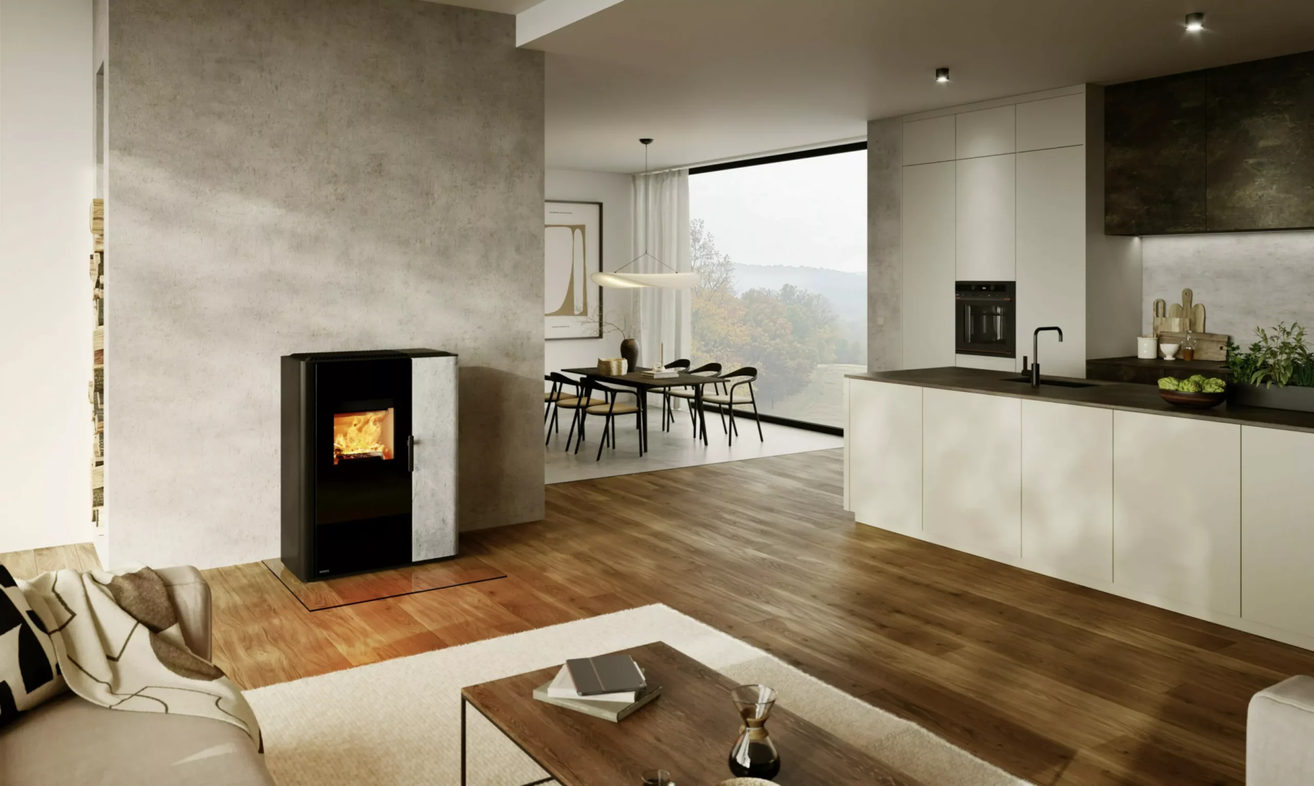 Calefacción dual de nueva generación. La nueva versión del modelo INDUO III de Rika, impresiona por su moderno diseño y su avanzada tecnología de alto rendimiento. Sus líneas claras y bordes suavemente redondeados le confieren elegancia, mientras que su gran ventana de visualización del fuego, resalta perfectamente las llamas. Este modelo combi, es sinónimo de flexibilidad. Además de pellets, puede quemar incluso troncos de hasta 33 cm de largo. Sus nuevas funciones, como la regulación dinámica del aire (sistema DAR) y MULTIAIR, ofrecen un funcionamiento óptimo y eficiente de la calefacción. Además, el cómodo control por voz y remoto vía internet, lo convierten no sólo en un punto culminante visual, sino también funcional… en cualquier hogar.