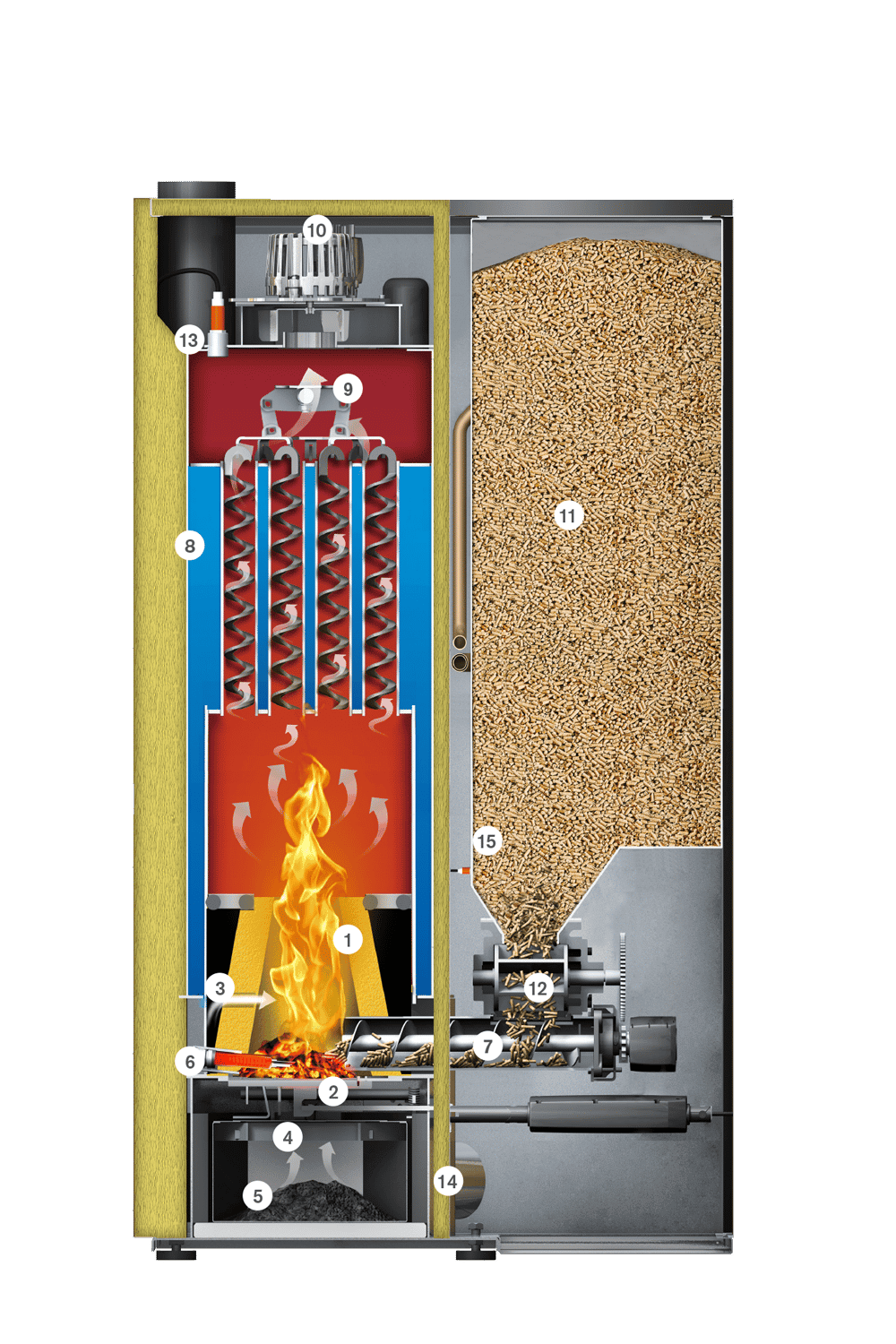 Tecnología convincente para la pequeña potencia. El nuevo Smart-PK impresiona por su diseño moderno, su tamaño compacto y su funcionalidad. El llenado manual permite una sensacional relación calidad-precio y un control individual sobre el llenado de combustible. El depósito permite un tiempo de combustión continuo de hasta diez días. La caldera de pellets Smart-PK 17-32 también está disponible como caldera Combi de pellets de leña.